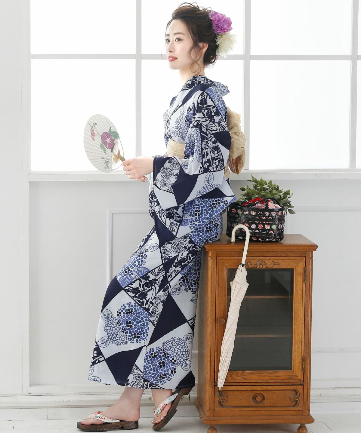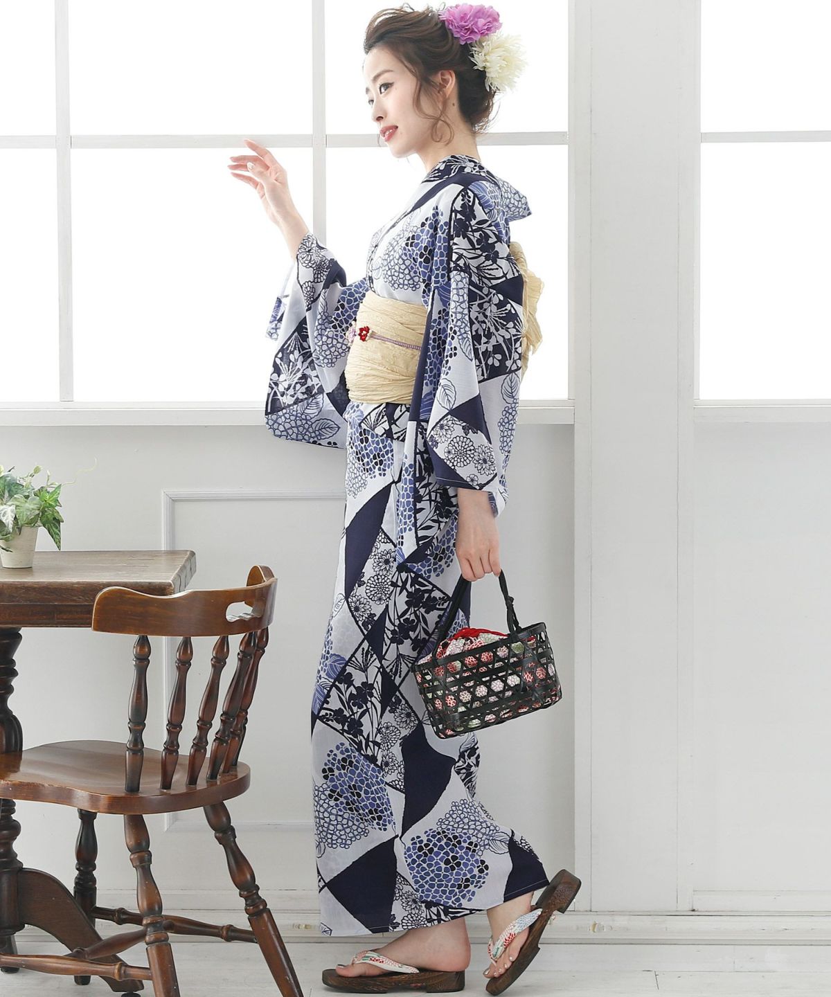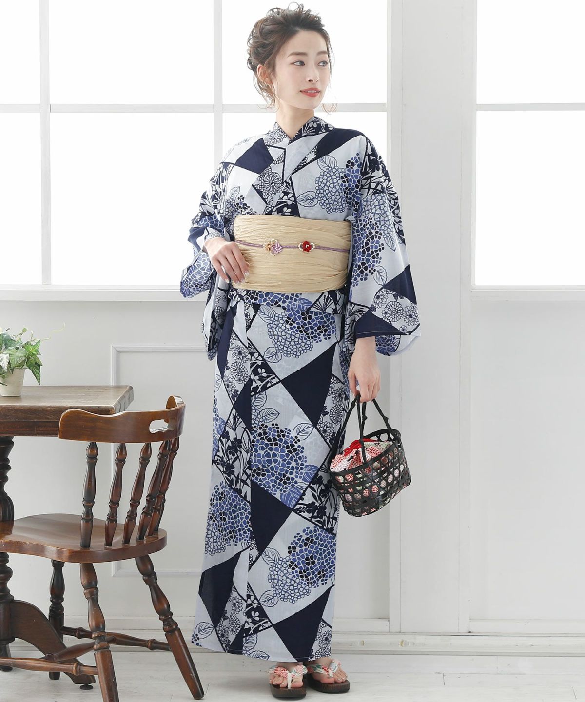 ◆4点セット(浴衣/着付け本/兵児帯/下駄:フリーサイズ23cm~25cm) ◆浴衣素材:ポリエステル100%、帯素材:ポリエステル100% |