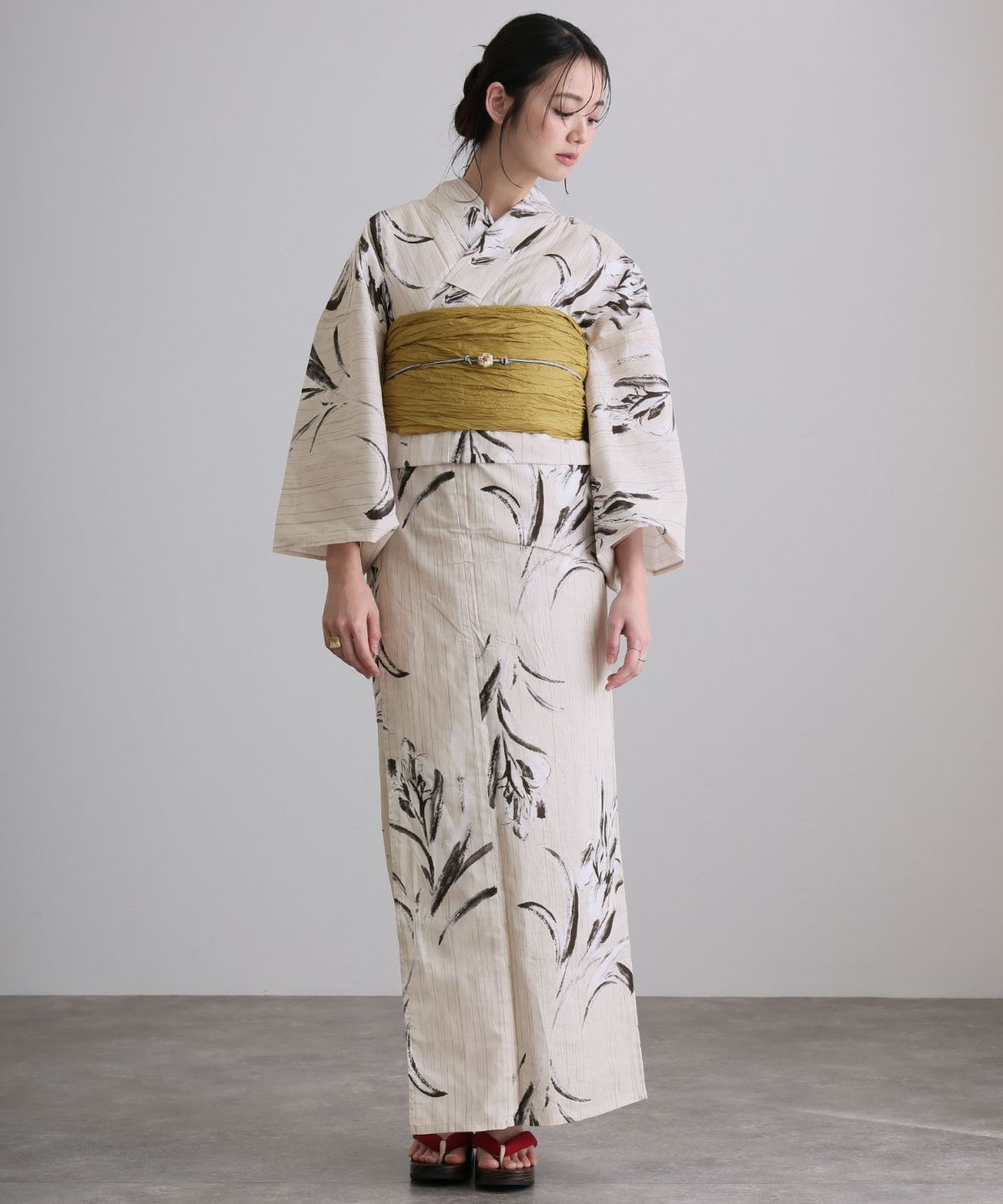 生成り色の地に、墨色の濃淡で描かれた葉が印象的な浴衣。