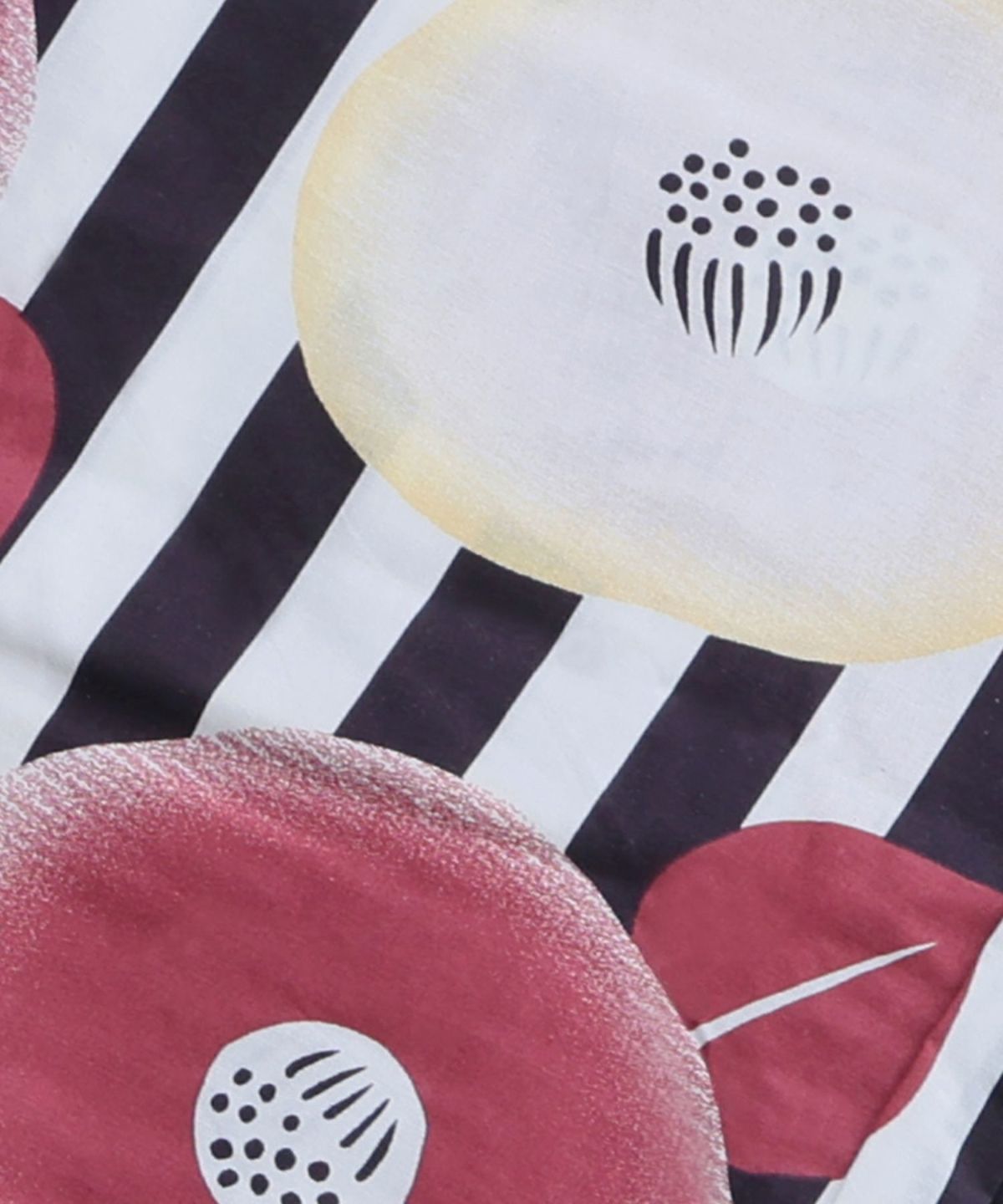 白地に映える黒のストライプと美しい花が、夏に特別な輝きを与えます。