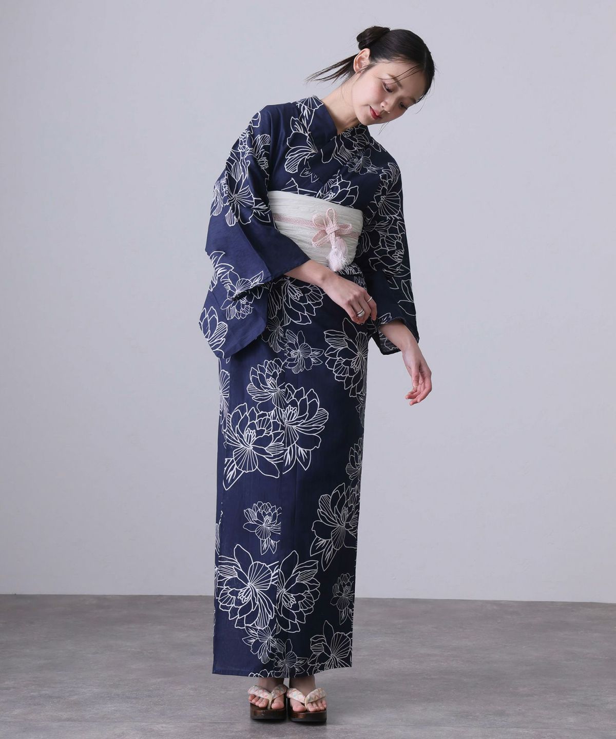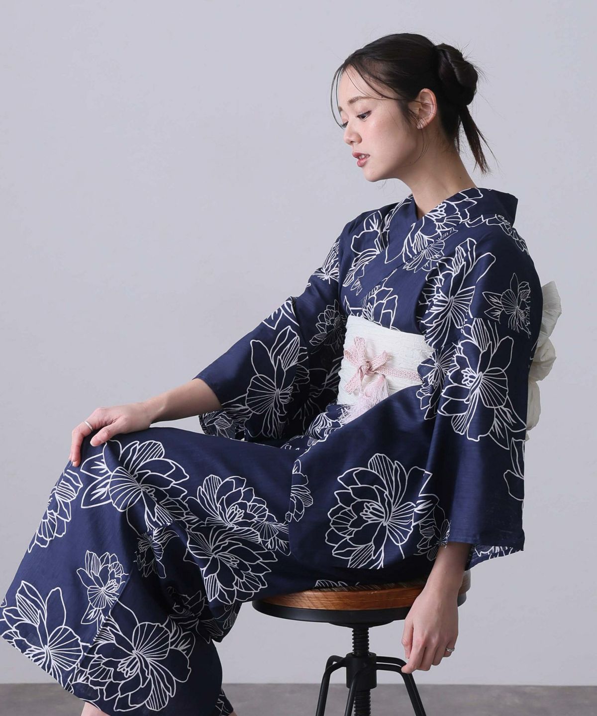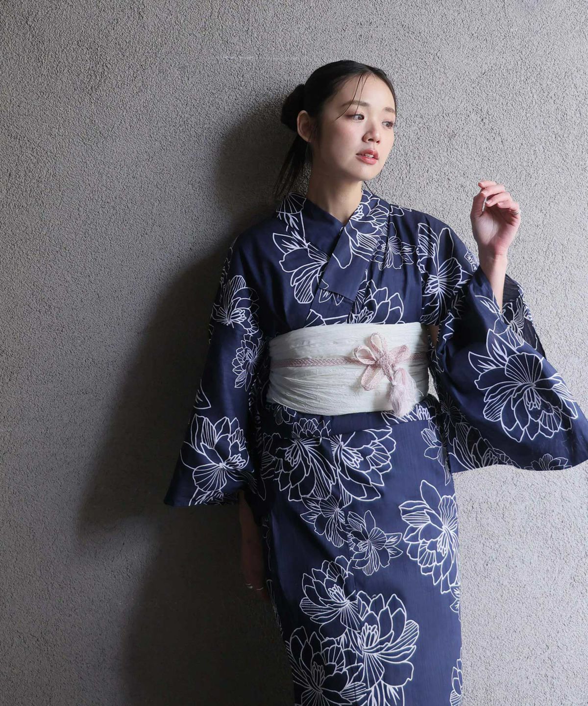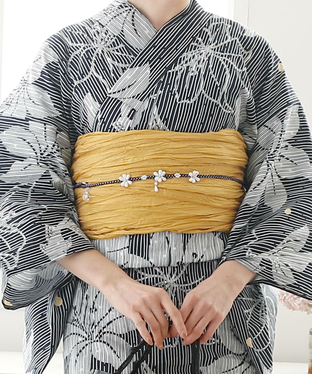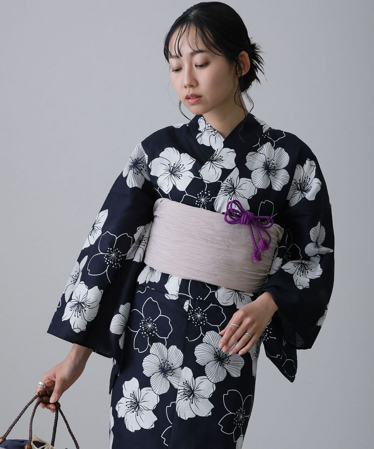 浴衣の王道色として、世代を問わず愛され続ける「紺・ネイビーの浴衣」。凛とした佇まいと知的な印象を与え、日本人の肌色にも美しく映えることから、初めての一着としても、長くご愛用いただく一着としても最適です。 紺・ネイビーの浴衣が持つ最大の魅力は、合わせる帯や小物次第で、多彩な表情を見せるその万能性にあります。例えば、白やシルバー系の帯を合わせれば、清涼感あふれる上品でクールな装いに。クリーム色や生成り色の帯を選べば、硬さが和らぎ、優しく落ち着いた雰囲気を演出できます。