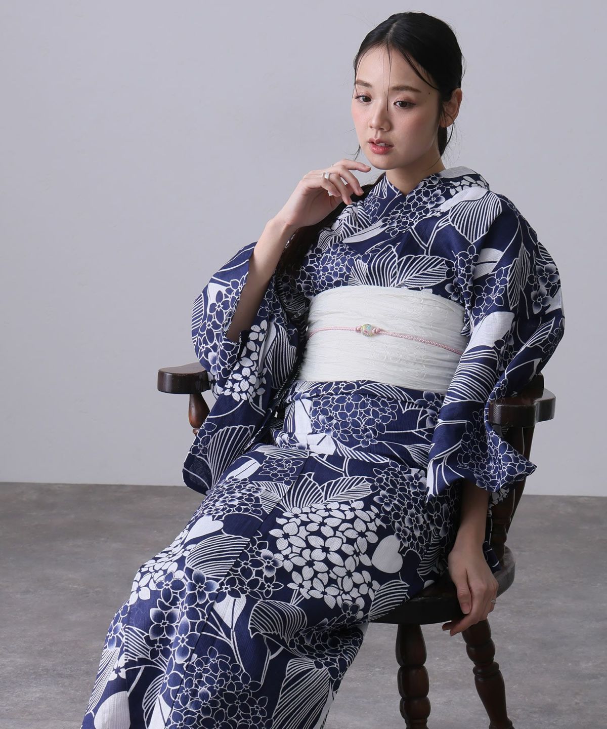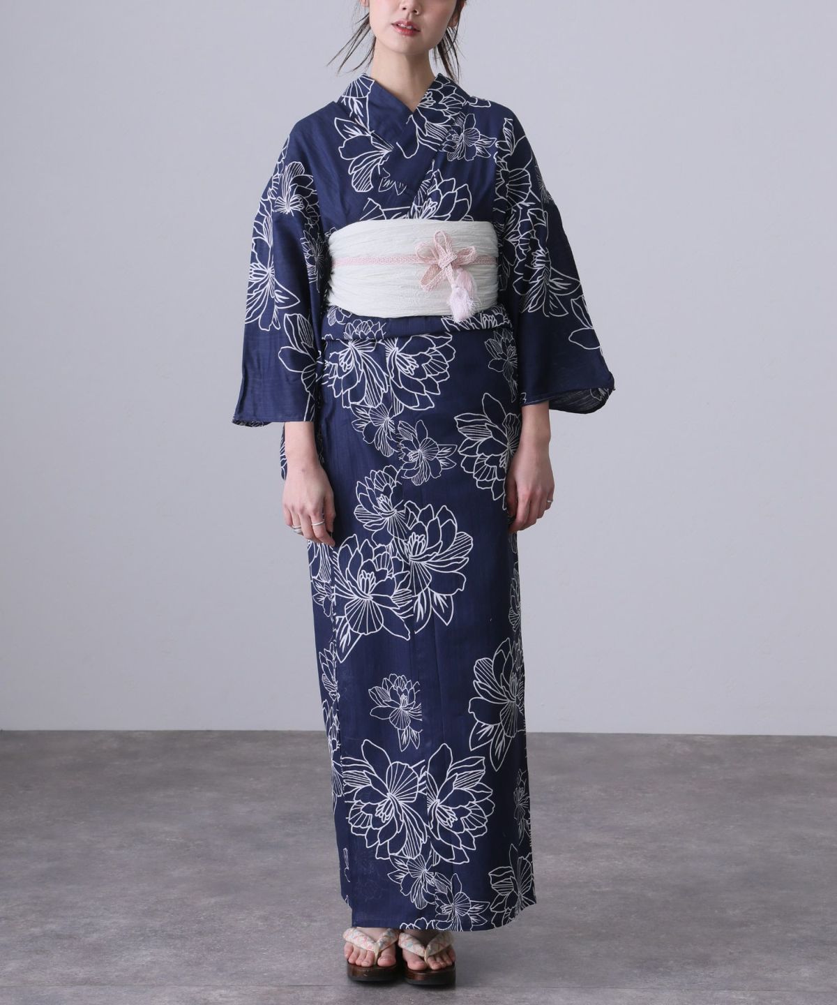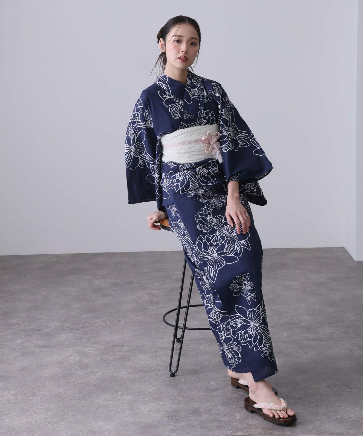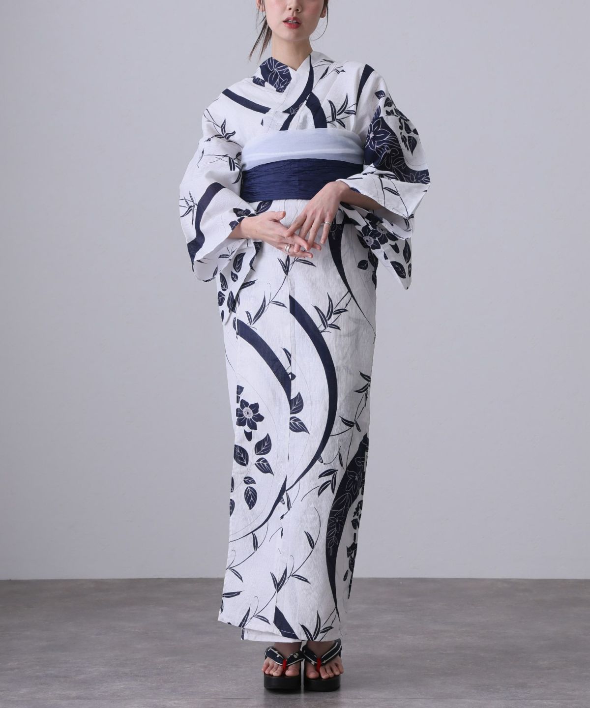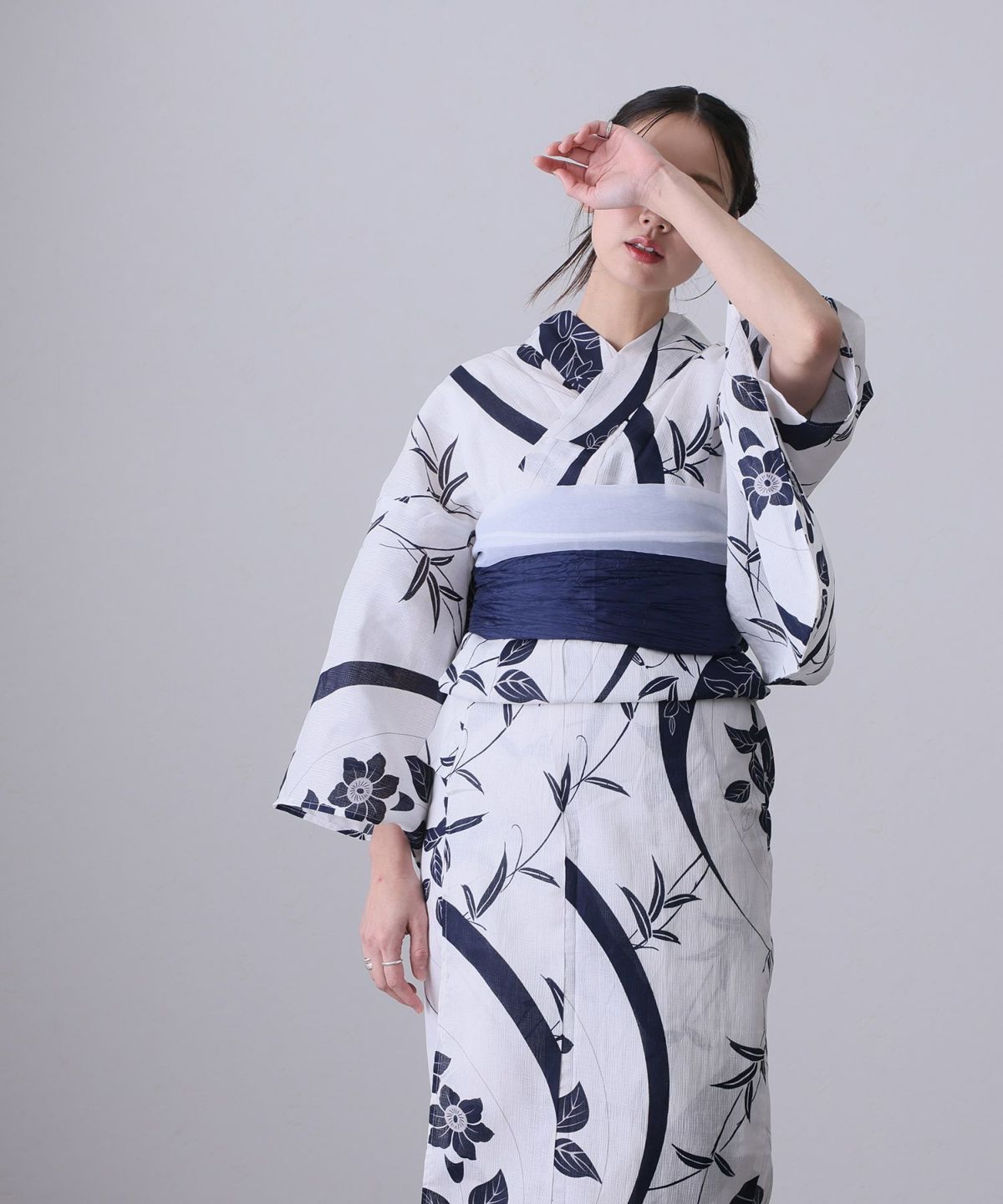 浴衣の王道色として、世代を問わず愛され続ける「紺・ネイビーの浴衣」。凛とした佇まいと知的な印象を与え、日本人の肌色にも美しく映えることから、初めての一着としても、長くご愛用いただく一着としても最適です。 紺・ネイビーの浴衣が持つ最大の魅力は、合わせる帯や小物次第で、多彩な表情を見せるその万能性にあります。例えば、白やシルバー系の帯を合わせれば、清涼感あふれる上品でクールな装いに。クリーム色や生成り色の帯を選べば、硬さが和らぎ、優しく落ち着いた雰囲気を演出できます。