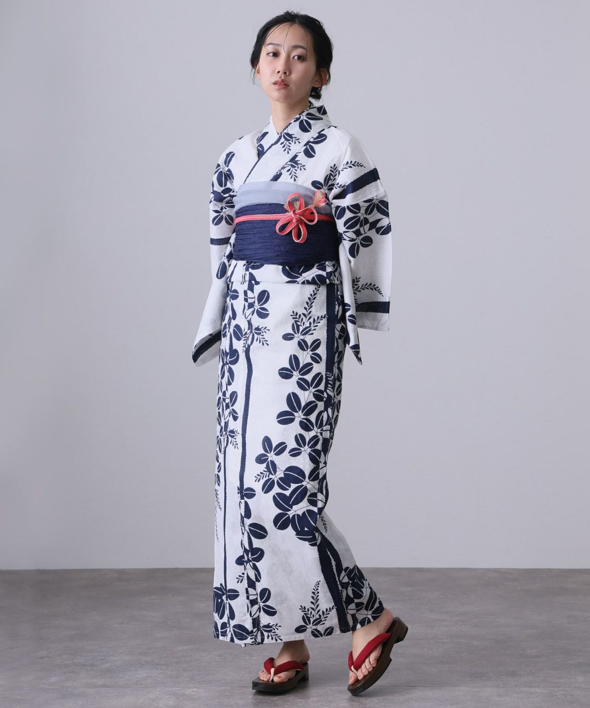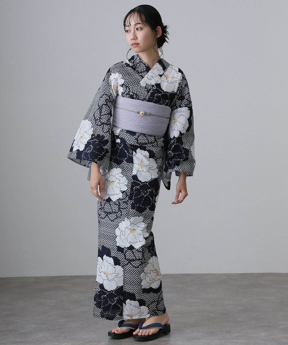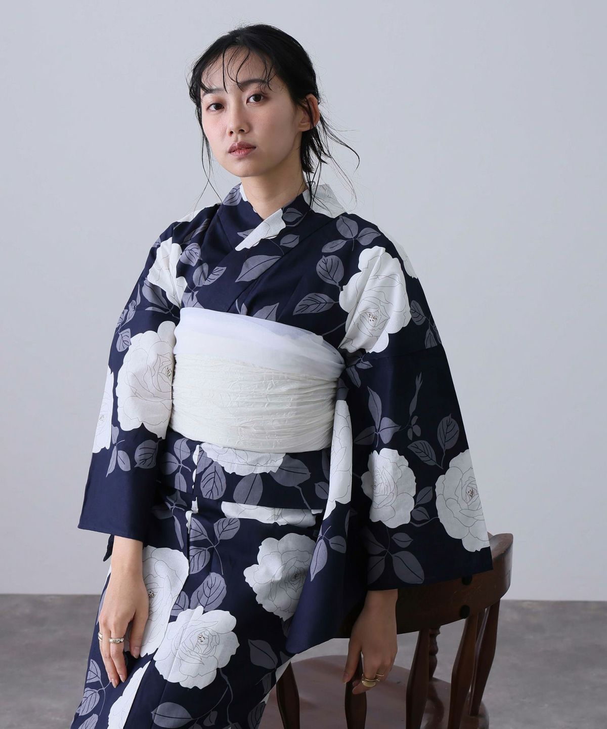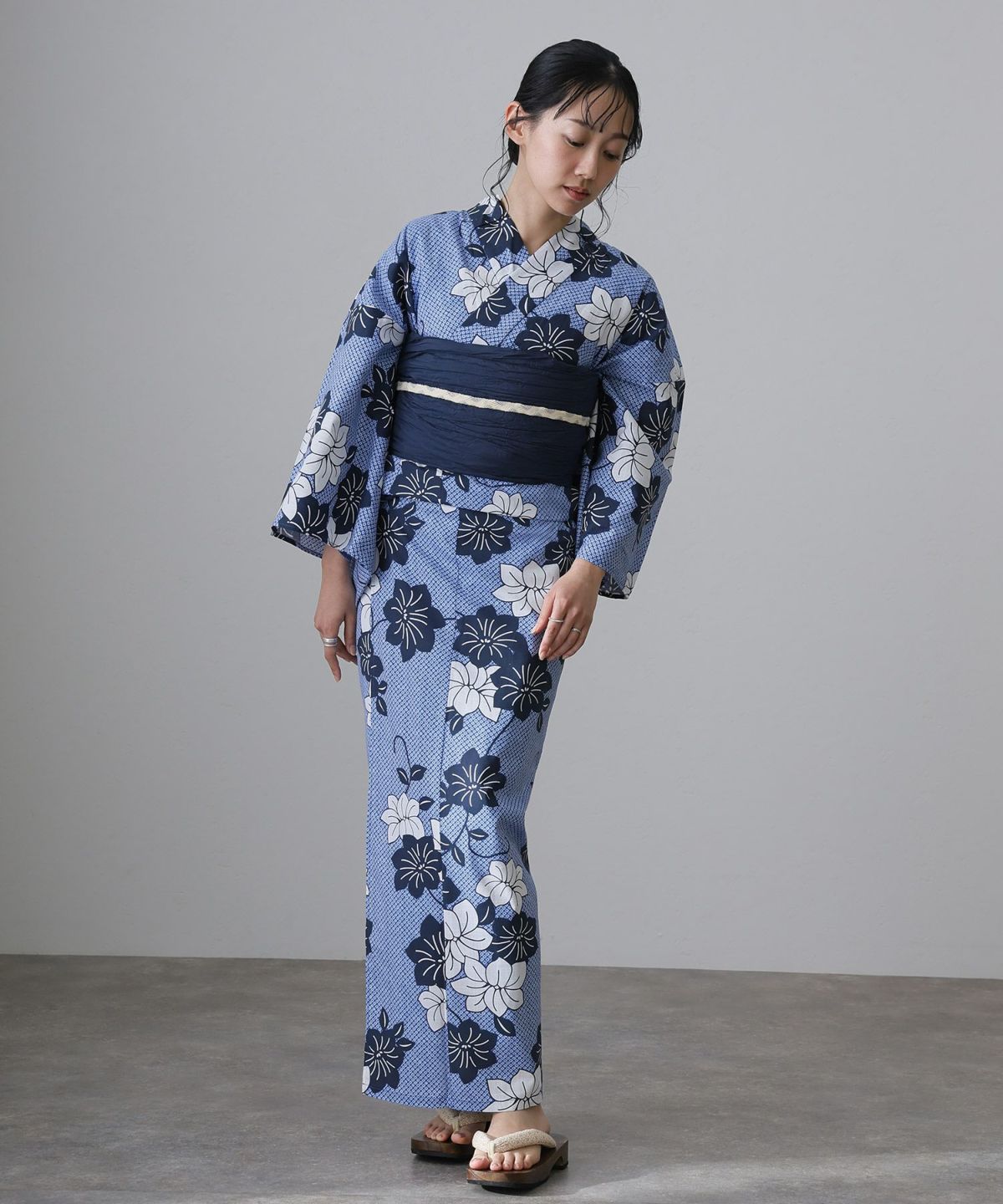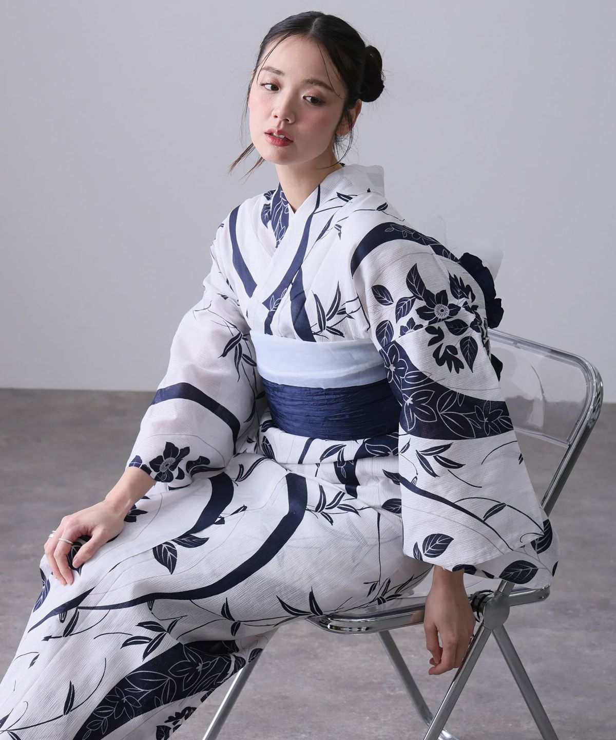 浴衣の王道色として、世代を問わず愛され続ける「紺・ネイビーの浴衣」。凛とした佇まいと知的な印象を与え、日本人の肌色にも美しく映えることから、初めての一着としても、長くご愛用いただく一着としても最適です。 紺・ネイビーの浴衣が持つ最大の魅力は、合わせる帯や小物次第で、多彩な表情を見せるその万能性にあります。例えば、白やシルバー系の帯を合わせれば、清涼感あふれる上品でクールな装いに。クリーム色や生成り色の帯を選べば、硬さが和らぎ、優しく落ち着いた雰囲気を演出できます。