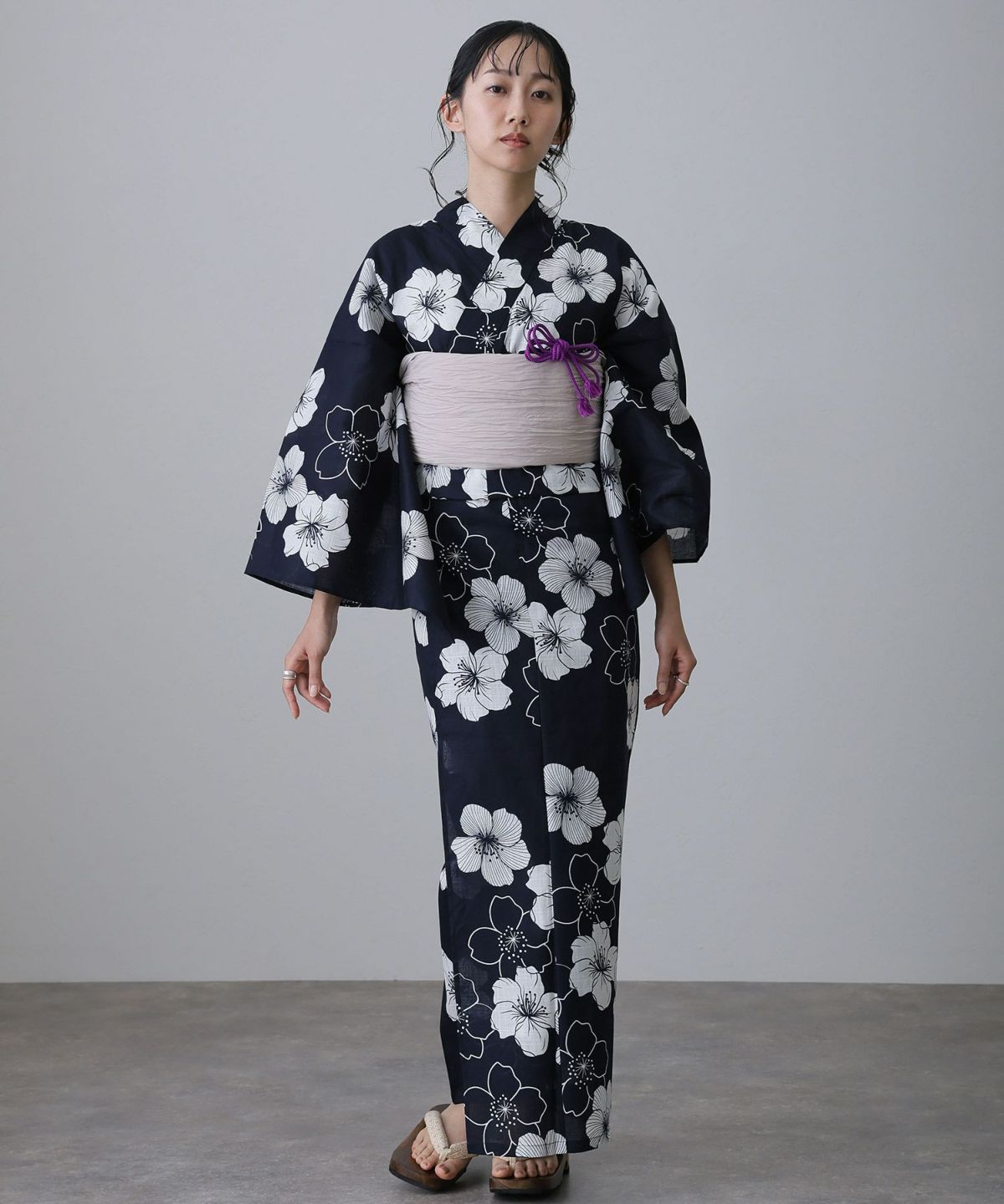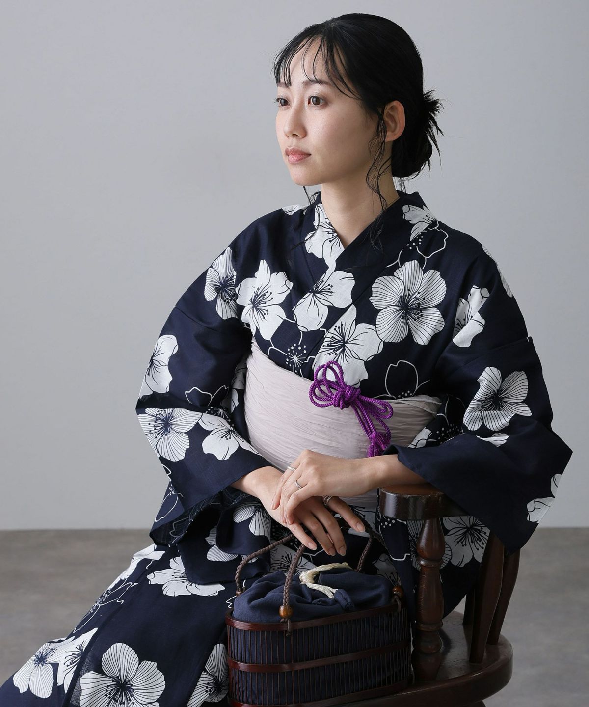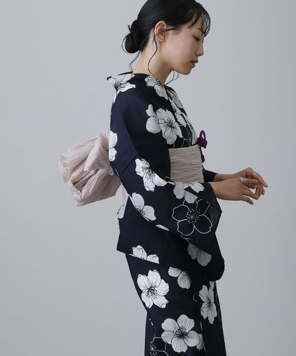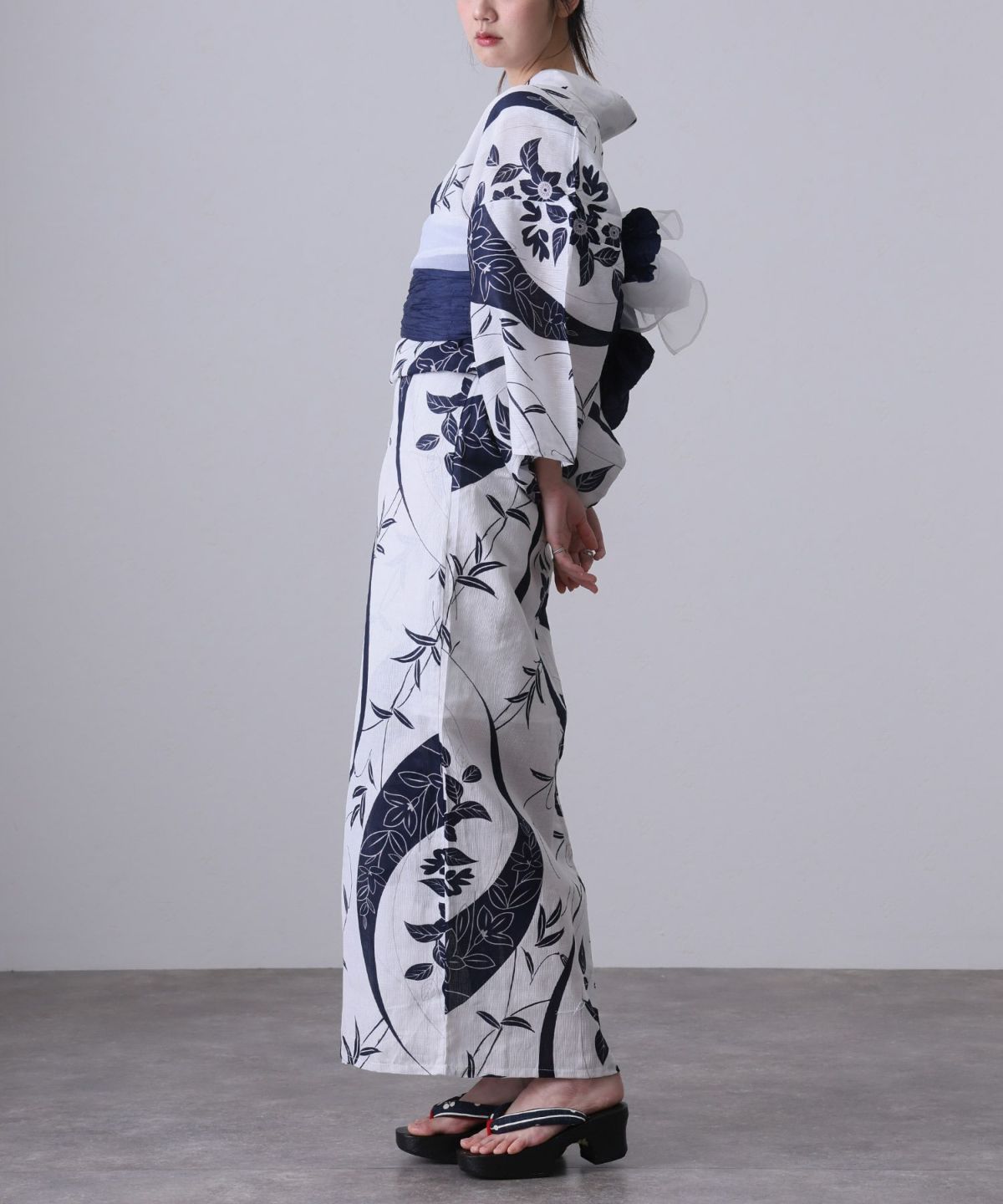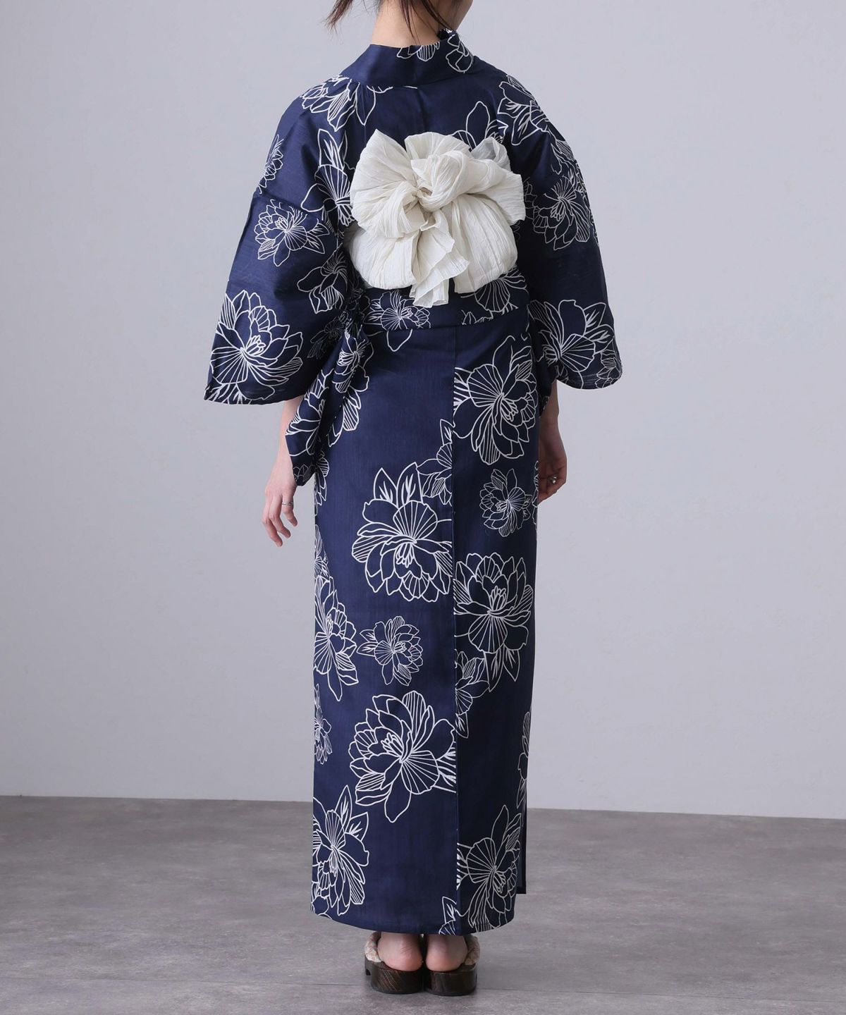 浴衣の王道色として、世代を問わず愛され続ける「紺・ネイビーの浴衣」。凛とした佇まいと知的な印象を与え、日本人の肌色にも美しく映えることから、初めての一着としても、長くご愛用いただく一着としても最適です。 紺・ネイビーの浴衣が持つ最大の魅力は、合わせる帯や小物次第で、多彩な表情を見せるその万能性にあります。例えば、白やシルバー系の帯を合わせれば、清涼感あふれる上品でクールな装いに。クリーム色や生成り色の帯を選べば、硬さが和らぎ、優しく落ち着いた雰囲気を演出できます。