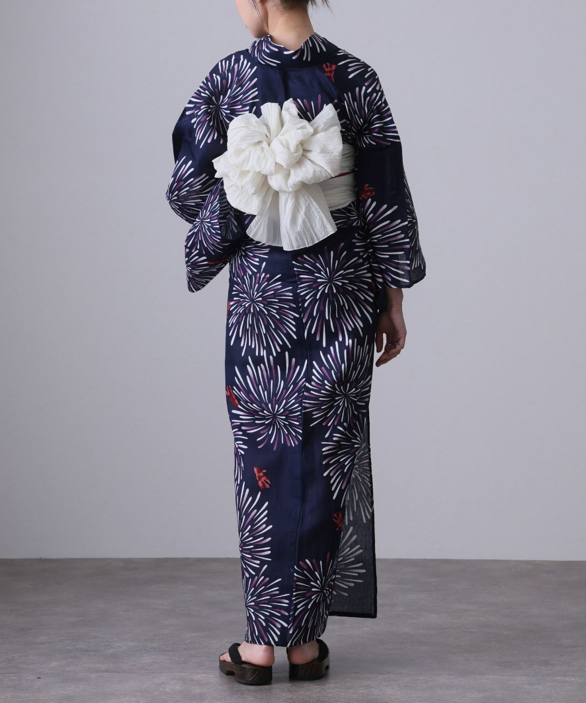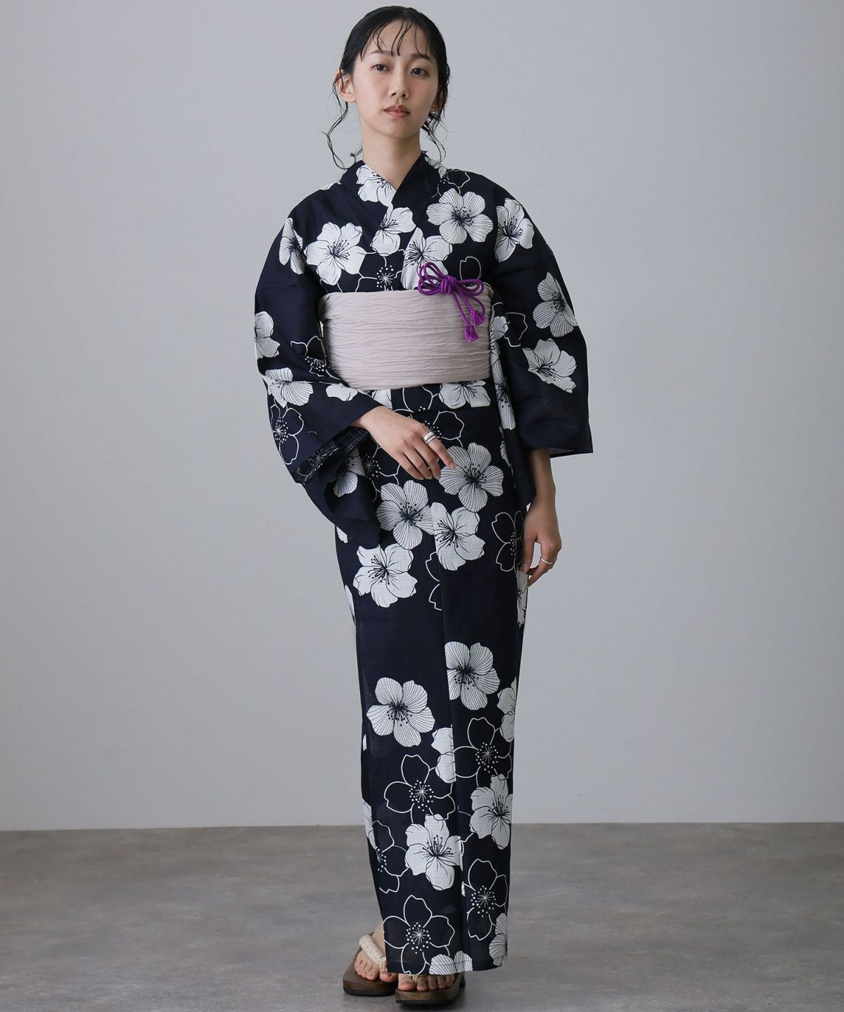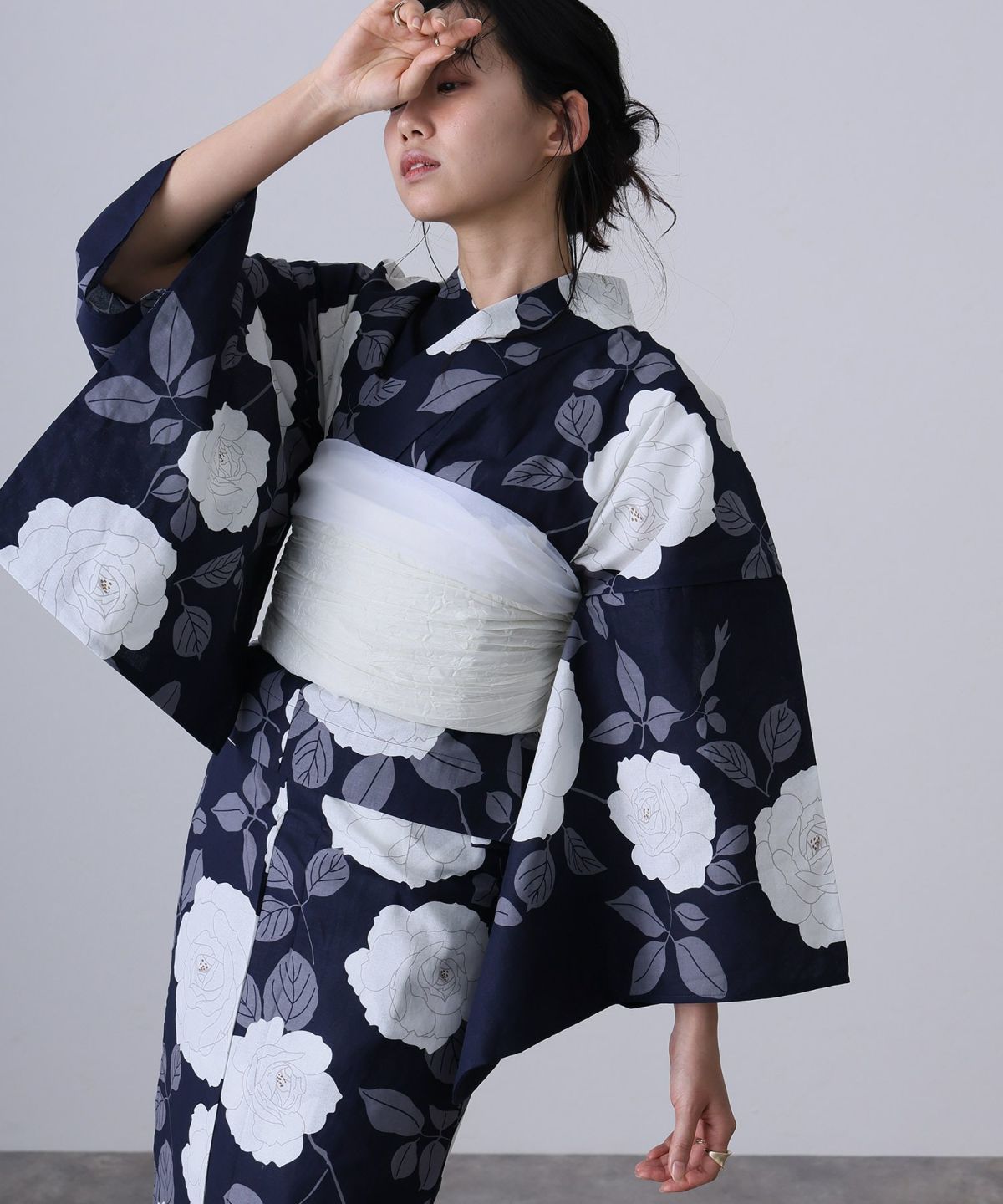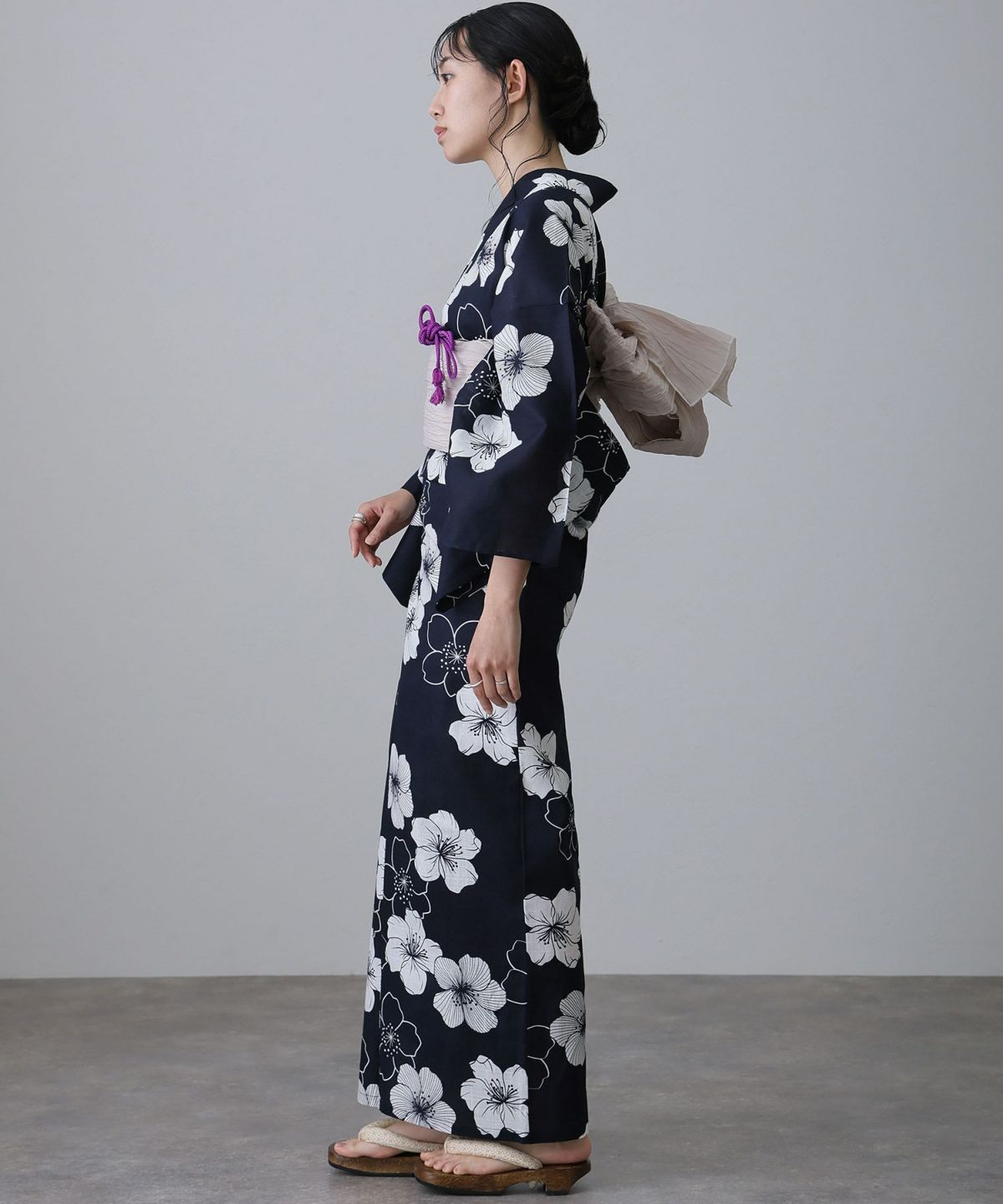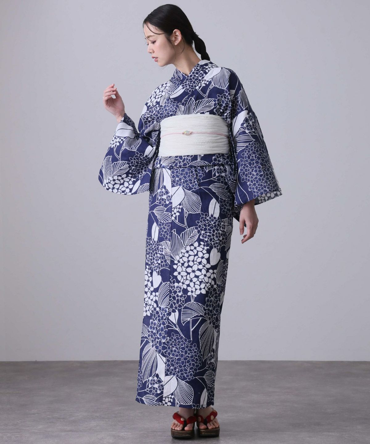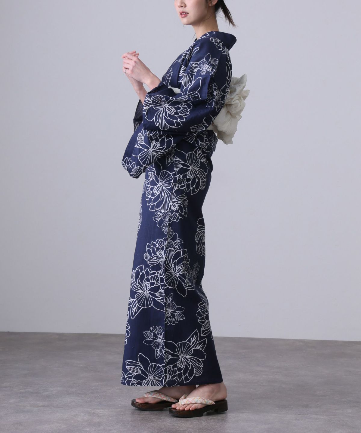 浴衣の王道色として、世代を問わず愛され続ける「紺・ネイビーの浴衣」。凛とした佇まいと知的な印象を与え、日本人の肌色にも美しく映えることから、初めての一着としても、長くご愛用いただく一着としても最適です。 紺・ネイビーの浴衣が持つ最大の魅力は、合わせる帯や小物次第で、多彩な表情を見せるその万能性にあります。例えば、白やシルバー系の帯を合わせれば、清涼感あふれる上品でクールな装いに。クリーム色や生成り色の帯を選べば、硬さが和らぎ、優しく落ち着いた雰囲気を演出できます。