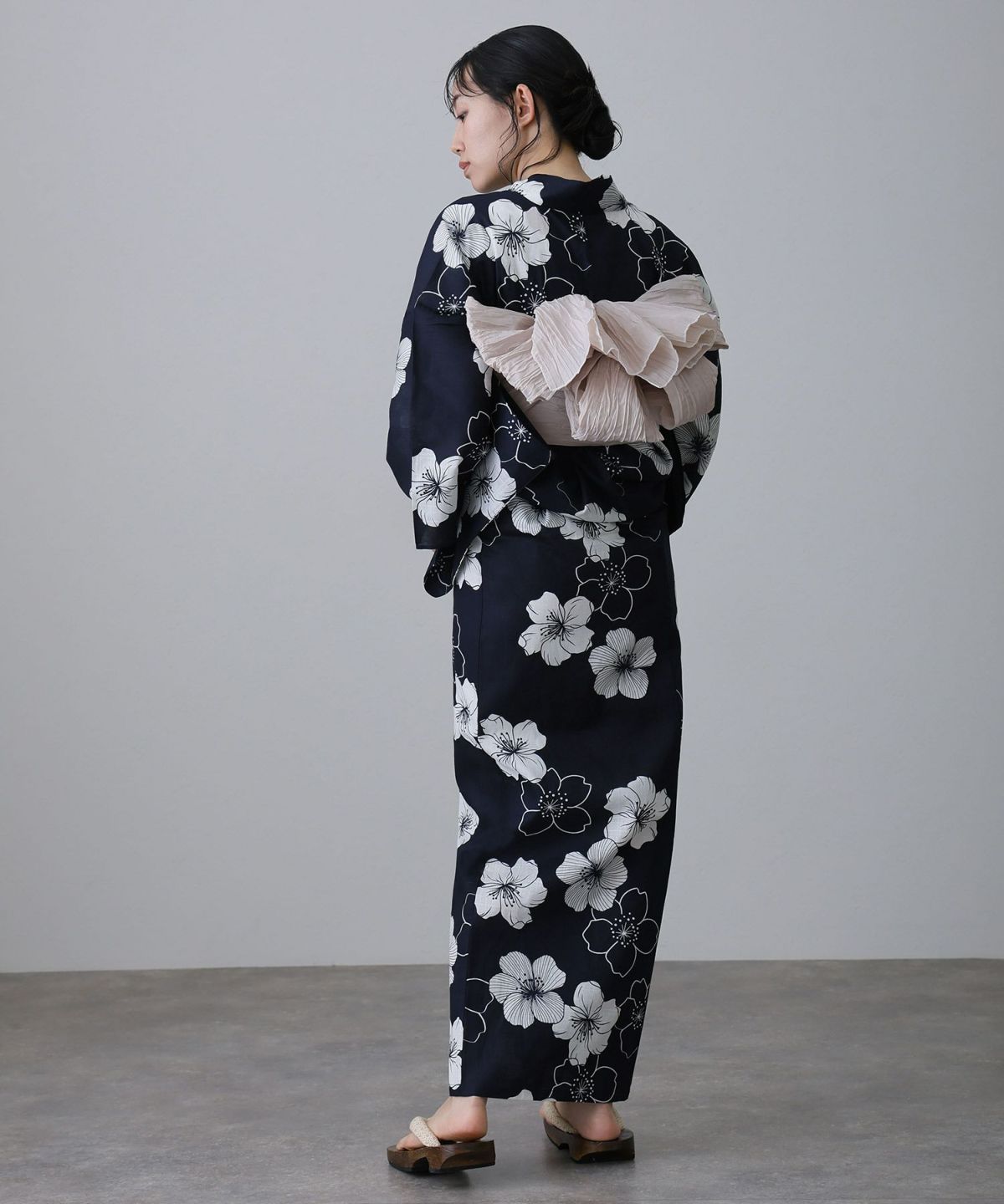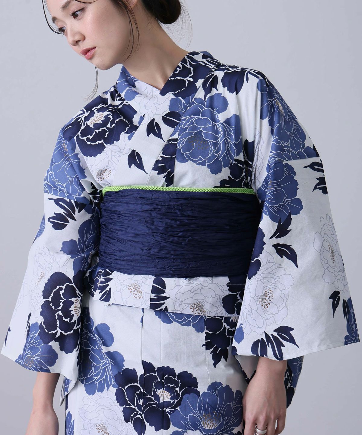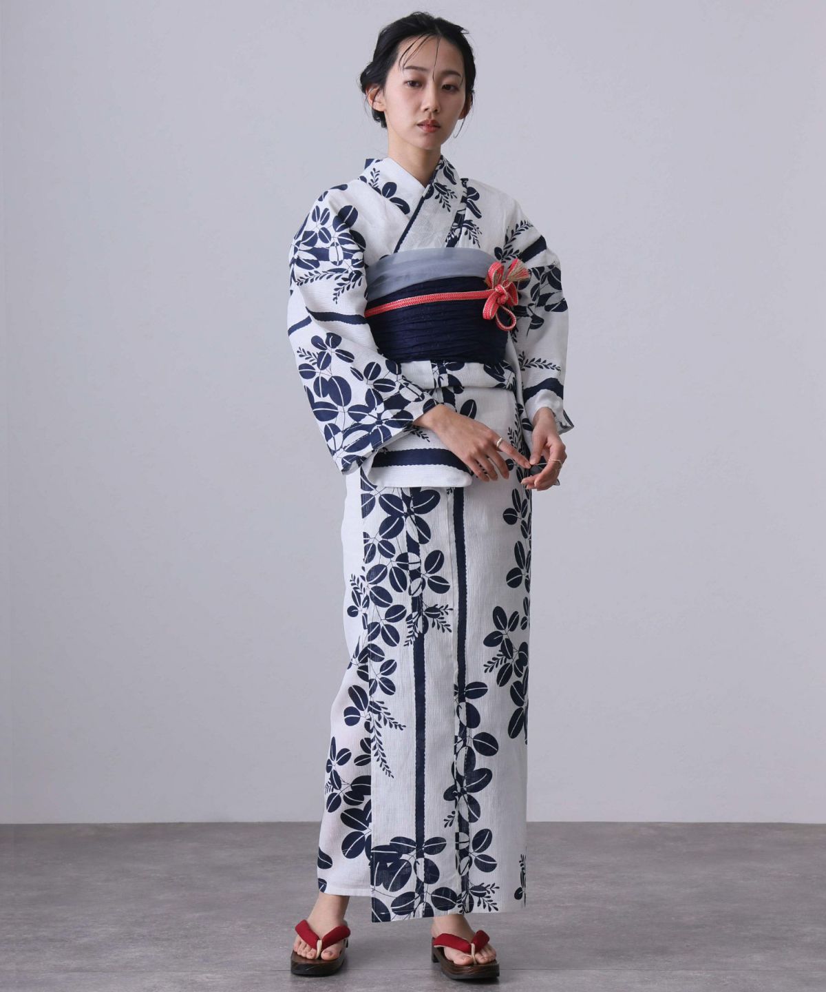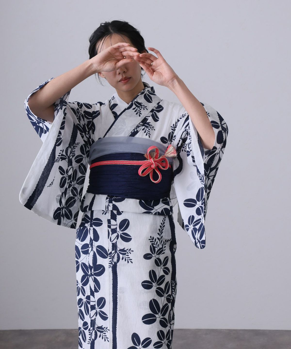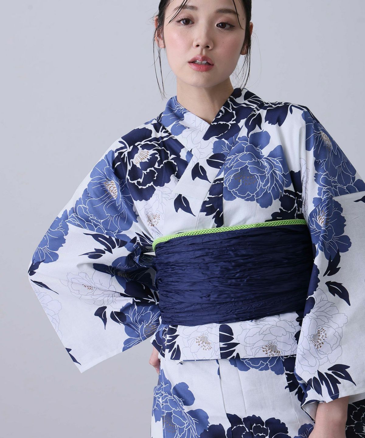 浴衣の王道色として、世代を問わず愛され続ける「紺・ネイビーの浴衣」。凛とした佇まいと知的な印象を与え、日本人の肌色にも美しく映えることから、初めての一着としても、長くご愛用いただく一着としても最適です。 紺・ネイビーの浴衣が持つ最大の魅力は、合わせる帯や小物次第で、多彩な表情を見せるその万能性にあります。例えば、白やシルバー系の帯を合わせれば、清涼感あふれる上品でクールな装いに。クリーム色や生成り色の帯を選べば、硬さが和らぎ、優しく落ち着いた雰囲気を演出できます。