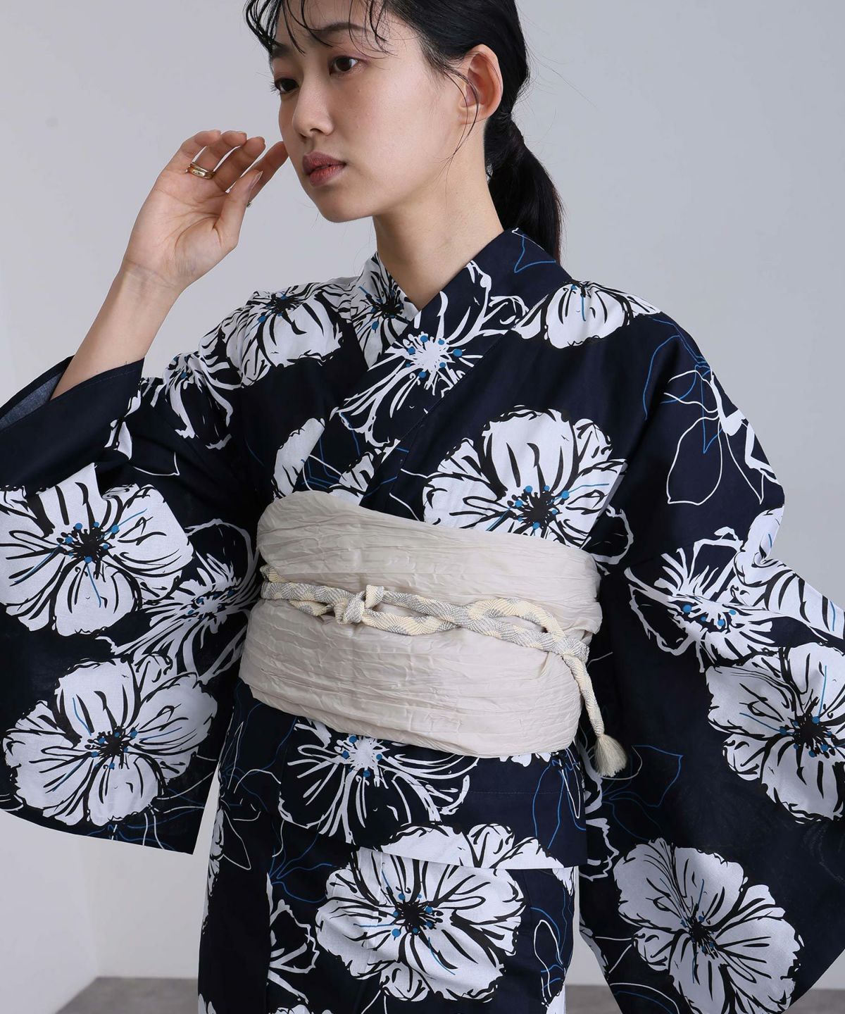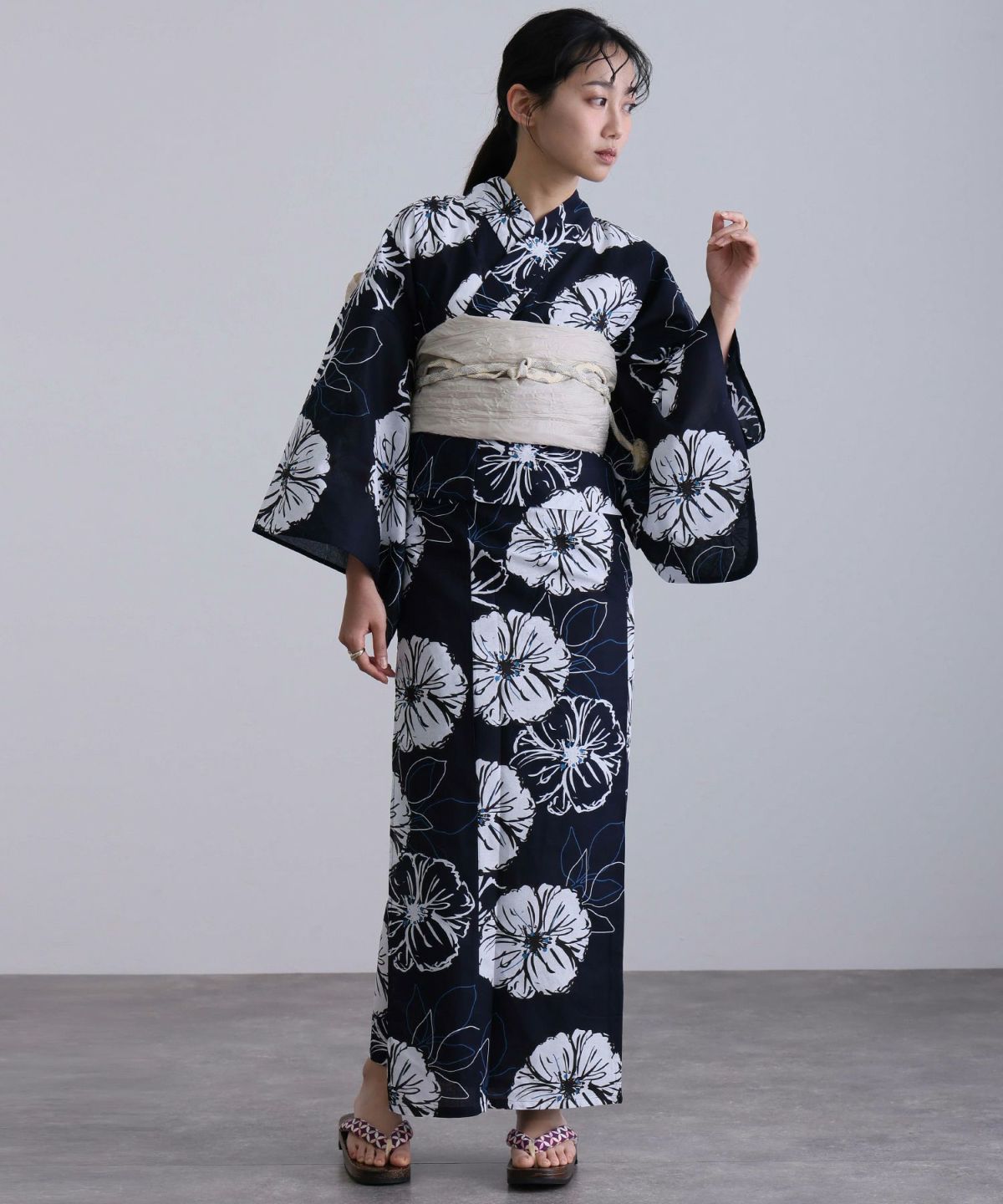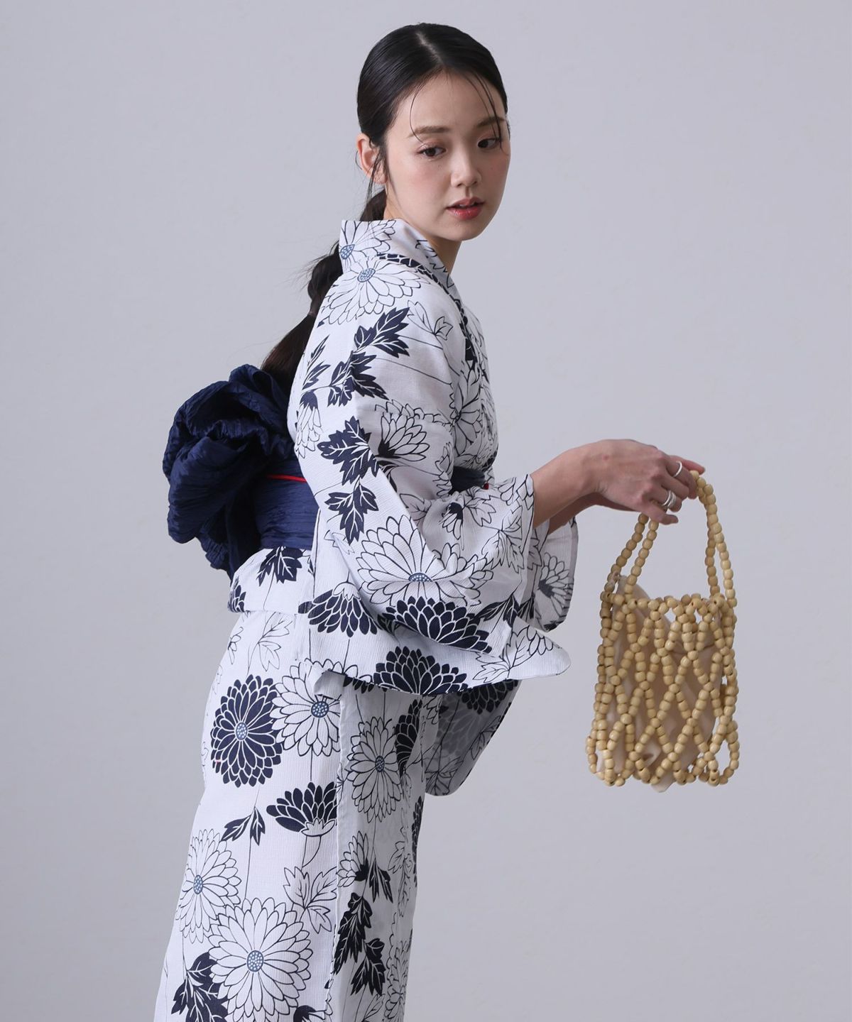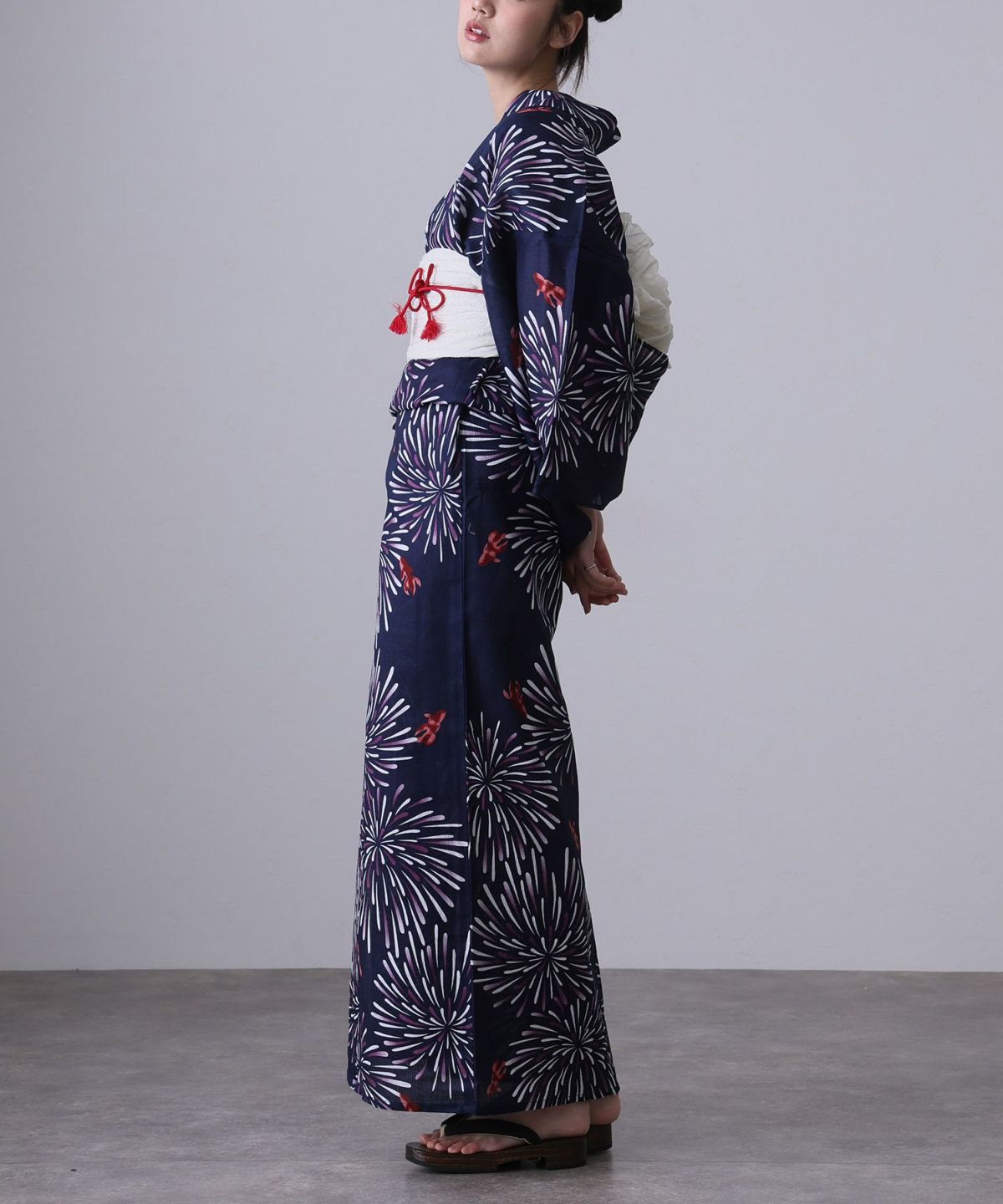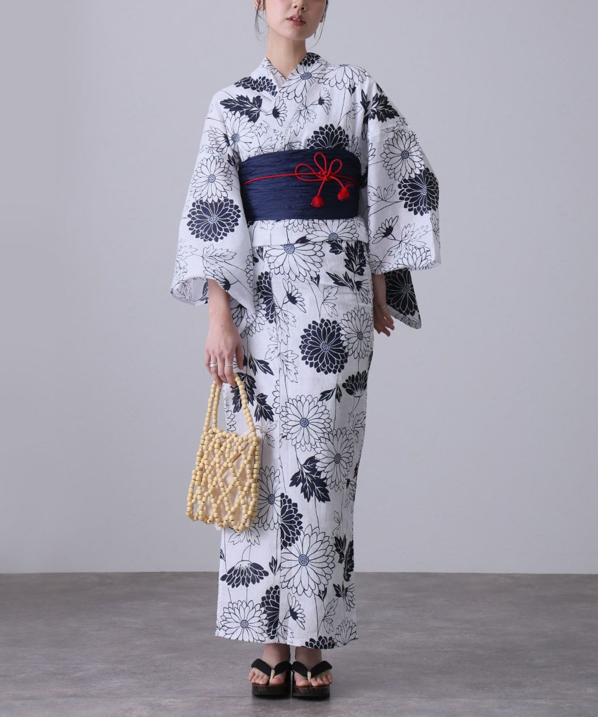 浴衣の王道色として、世代を問わず愛され続ける「紺・ネイビーの浴衣」。凛とした佇まいと知的な印象を与え、日本人の肌色にも美しく映えることから、初めての一着としても、長くご愛用いただく一着としても最適です。 紺・ネイビーの浴衣が持つ最大の魅力は、合わせる帯や小物次第で、多彩な表情を見せるその万能性にあります。例えば、白やシルバー系の帯を合わせれば、清涼感あふれる上品でクールな装いに。クリーム色や生成り色の帯を選べば、硬さが和らぎ、優しく落ち着いた雰囲気を演出できます。