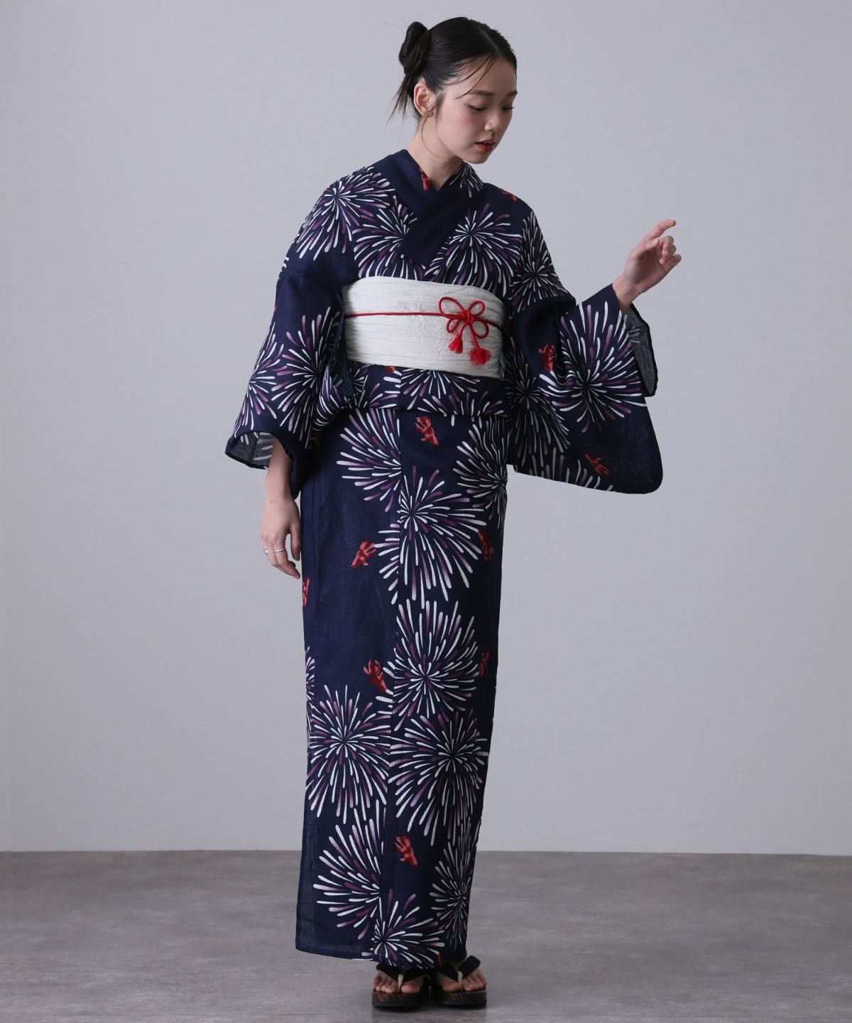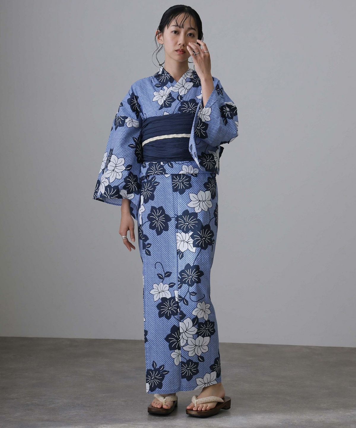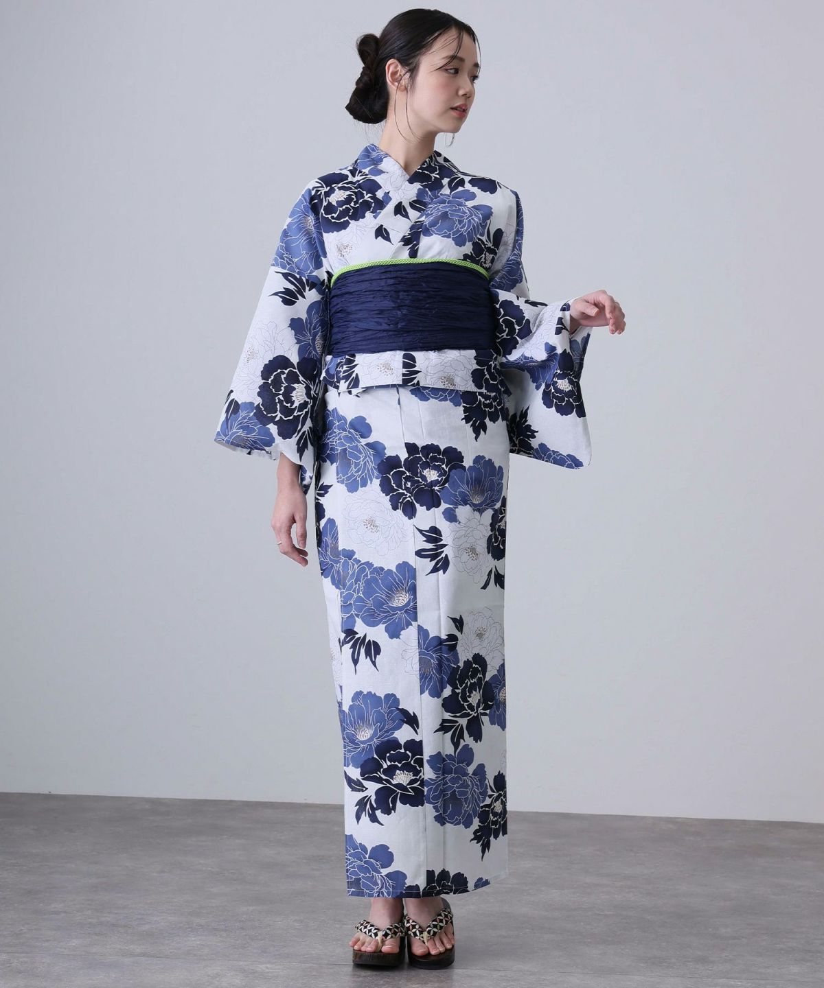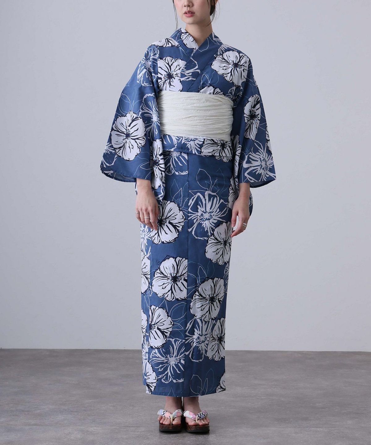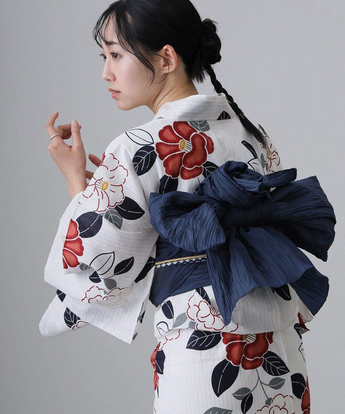 浴衣の王道色として、世代を問わず愛され続ける「紺・ネイビーの浴衣」。凛とした佇まいと知的な印象を与え、日本人の肌色にも美しく映えることから、初めての一着としても、長くご愛用いただく一着としても最適です。 紺・ネイビーの浴衣が持つ最大の魅力は、合わせる帯や小物次第で、多彩な表情を見せるその万能性にあります。例えば、白やシルバー系の帯を合わせれば、清涼感あふれる上品でクールな装いに。クリーム色や生成り色の帯を選べば、硬さが和らぎ、優しく落ち着いた雰囲気を演出できます。
