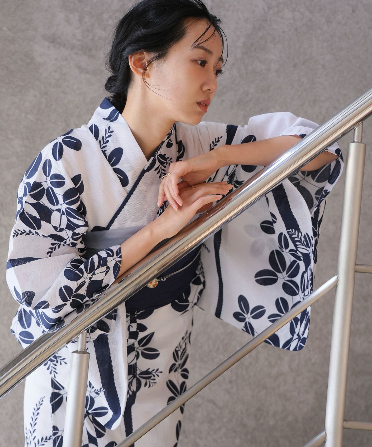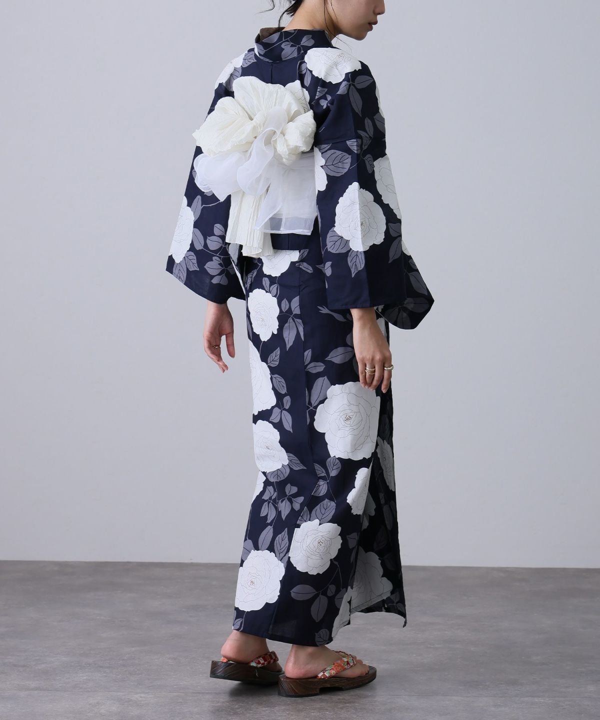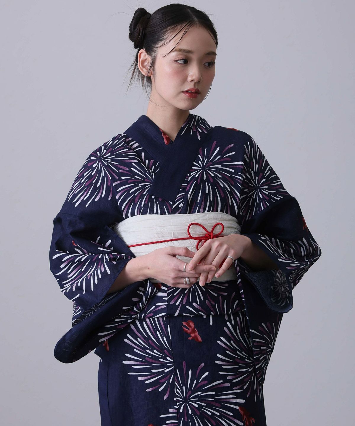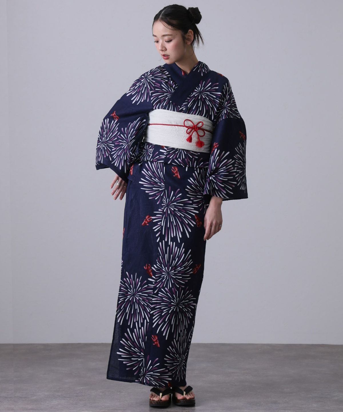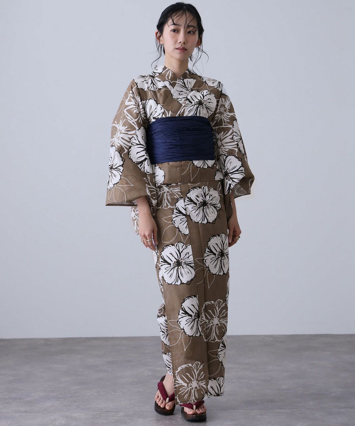 浴衣の王道色として、世代を問わず愛され続ける「紺・ネイビーの浴衣」。凛とした佇まいと知的な印象を与え、日本人の肌色にも美しく映えることから、初めての一着としても、長くご愛用いただく一着としても最適です。 紺・ネイビーの浴衣が持つ最大の魅力は、合わせる帯や小物次第で、多彩な表情を見せるその万能性にあります。例えば、白やシルバー系の帯を合わせれば、清涼感あふれる上品でクールな装いに。クリーム色や生成り色の帯を選べば、硬さが和らぎ、優しく落ち着いた雰囲気を演出できます。