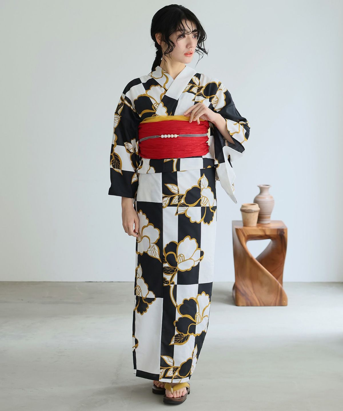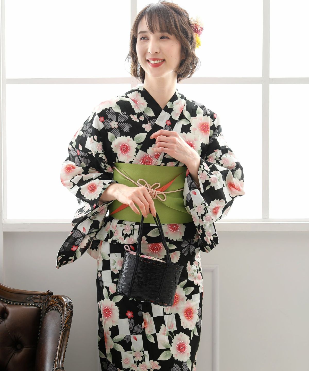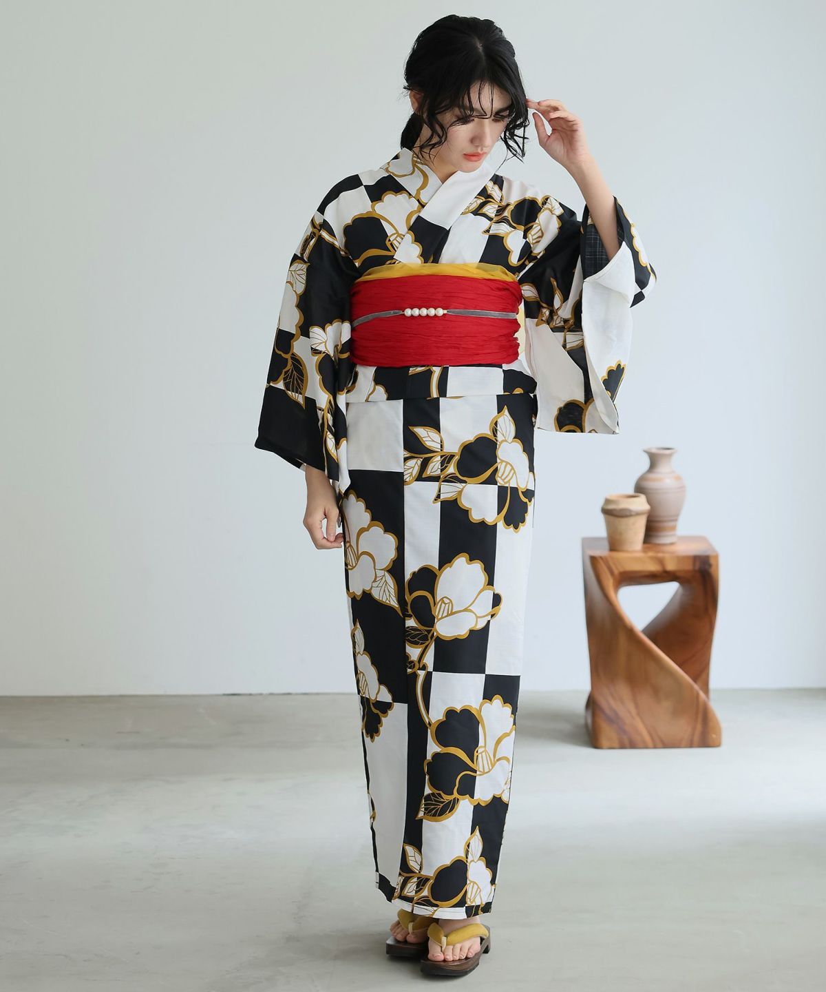 可憐に舞う桜と椿 桜と牡丹市松 浴衣4点セット(半巾帯)