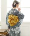 くしゅくしゅした素材のマスタードカラーのおしゃれな帯は、アレンジ自在の兵児帯となっています。
