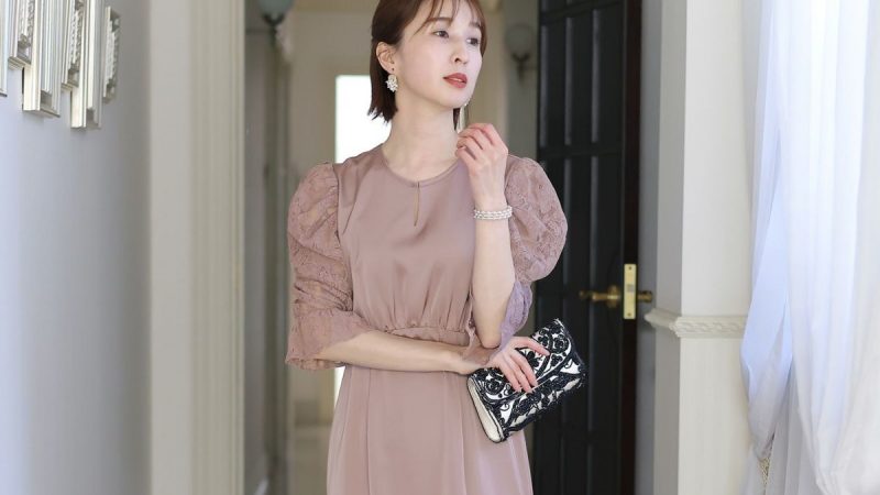 レース袖で上品に二の腕を隠し、ミディアム丈なので脚も見せすぎずウエスト切り替えで脚長効果もあります。スカートは少しコクーンデザインになっているのでヒップが気になる人にもおすすめです。